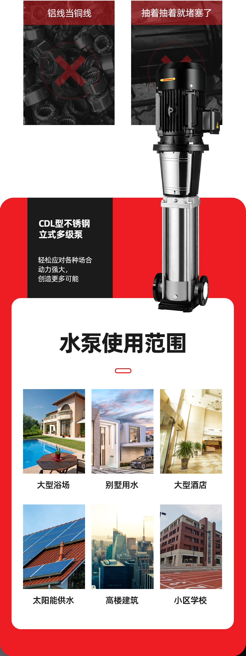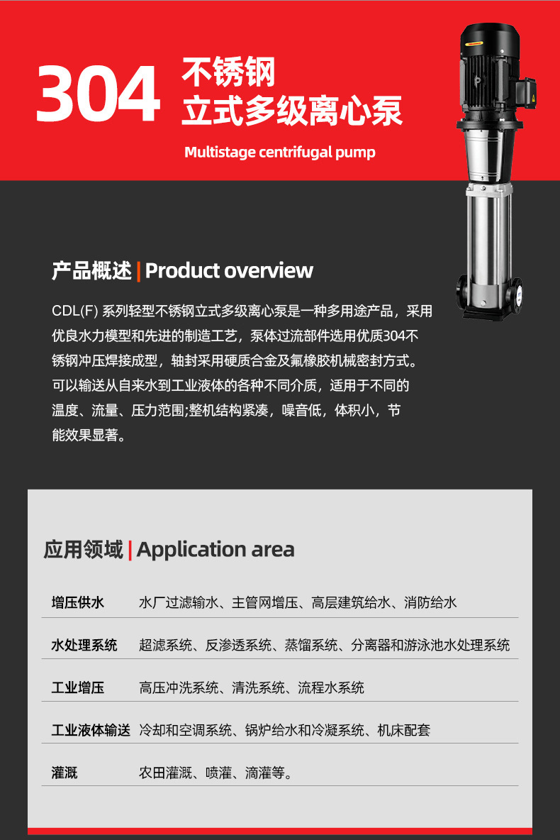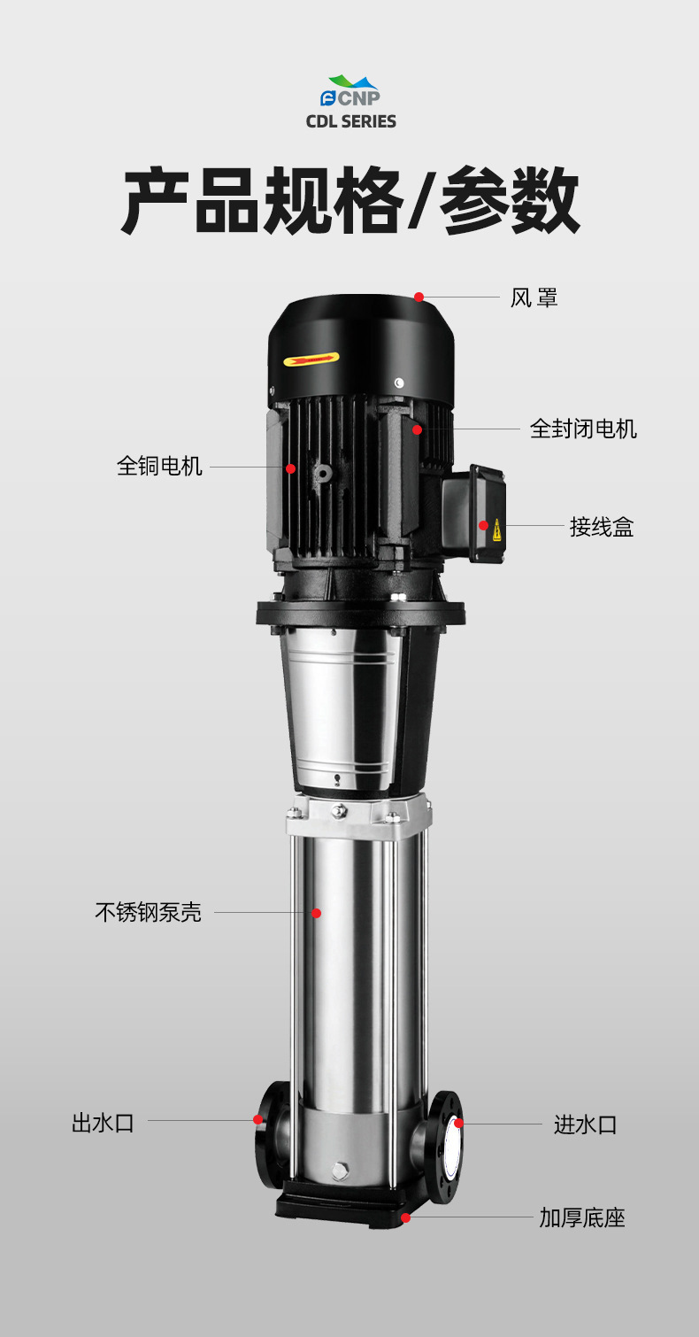 南方CDL,CDLF非自吸輕型立式多級離心泵,電機軸通過聯軸器直接與泵軸聯接,葉輪導葉采用不銹鋼板沖壓焊接或不銹鋼精密鑄造制成,泵進出水口在泵底同一直線上(可配IEC或NEMA電機)。