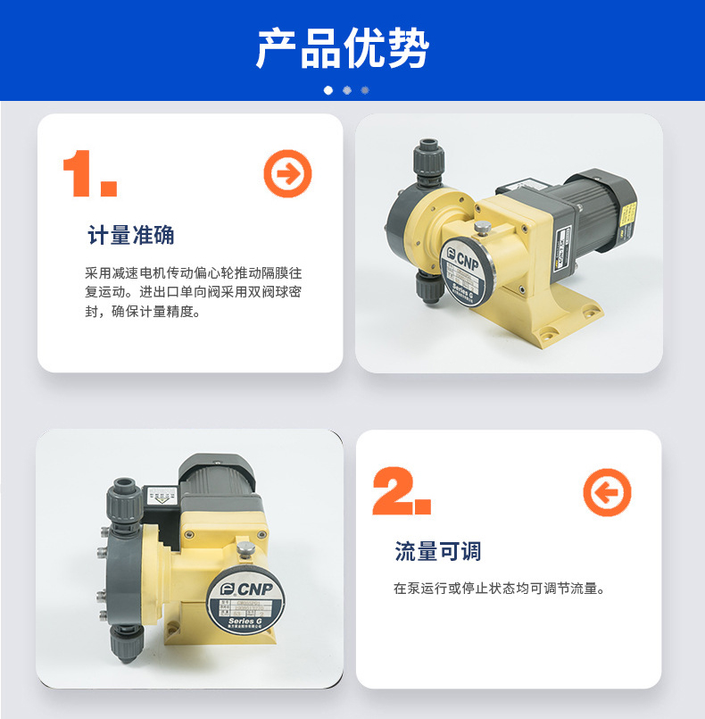 南方GW系列機械隔膜計量泵,采用減速電機傳動偏心輪推動隔膜往復運動。進出口單向閥采用雙閥球密封,確保計量精度。