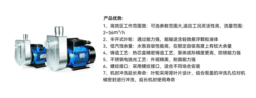 新產品NZXF小型不銹鋼自吸泵共推出三相12個型號,單相9個型號,可滿足304/316L材質需求,電機可滿足常規及防爆需求配置,常用于農村MBR膜污水處理、畜牧養殖行業加藥和消毒等場景。